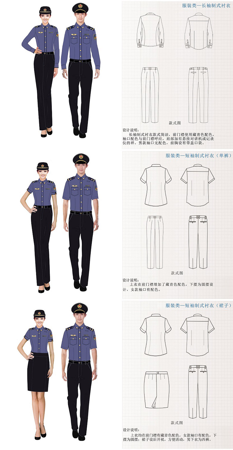 服裝顏色為藏青色及天空藍(lán)色,搭配金色標(biāo)志。服裝功能主要考慮適應(yīng)城市管理執(zhí)法工作場所多在戶外、街頭的實(shí)際,便于執(zhí)勤活動(dòng)。另外,《辦法》起草過程中,住建部還參考了公安、工商、食藥監(jiān)、海關(guān)等統(tǒng)一著裝部門的經(jīng)驗(yàn)做法,先后赴北京、西安、長沙、成都、???、黑河等14個(gè)城市進(jìn)行了調(diào)研,范圍覆蓋了熱區(qū)、亞熱區(qū)、南溫區(qū)、北溫區(qū)、寒區(qū)、高寒區(qū)等全部6個(gè)氣候區(qū)域,明確制服和標(biāo)志標(biāo)識(shí)的供應(yīng)種類為帽類、服裝類、鞋類、標(biāo)志標(biāo)識(shí)類、裝具類5大類18小類。
